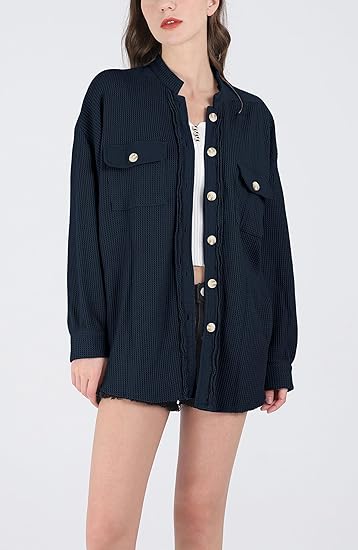 Waffle knit shacket jacket for women featuring slouchy batwing sleeve and distressed spliced design, front single breasted button up closure, chic stand collar, frayed raw hem with side split