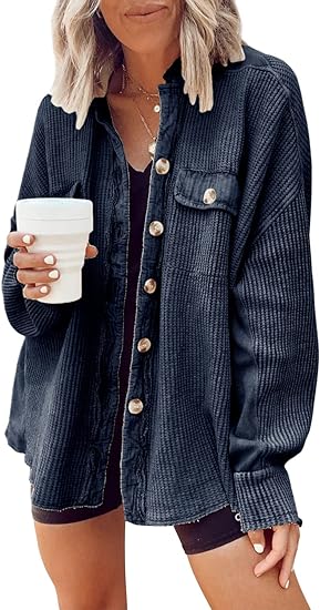 Casual and loose fit boyfriend shirt jacket, made of high quality and textured waffle knitted material; Suit for spring, fall and warm winter wear