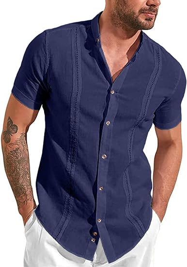Stylish Design: Mens Casual Linen Cotton Button Down Short Sleeve Shirts shirt features .With Band Collar, Vertical Pleats. High quality stitch. The design is eye-catching and perfect for a beach vacation or casual summer outing.